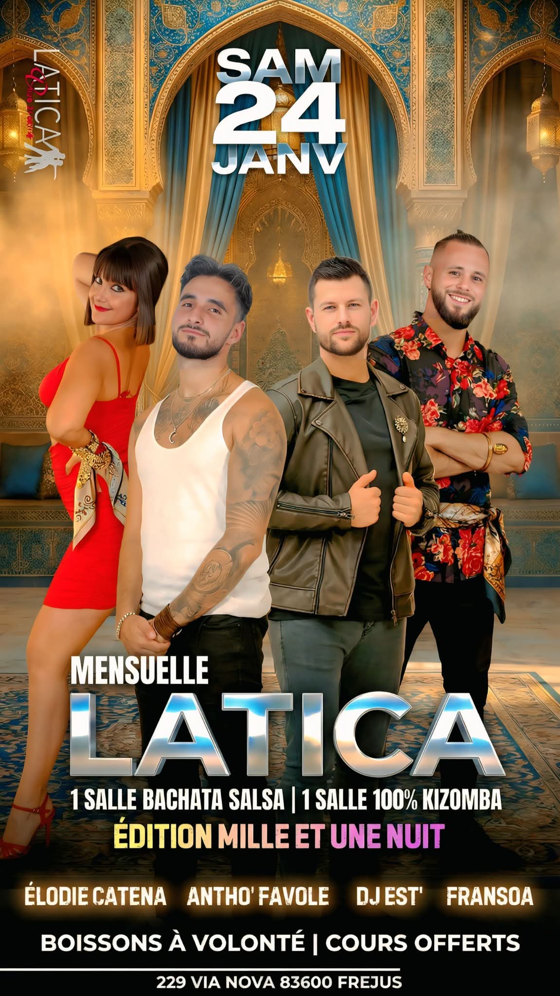 1 salle Bachata Salsa avec Antho Favole et 1 salle Kiz avec Dj Est', boissons à volonté c'est la Mensuelle Latica 🔥
